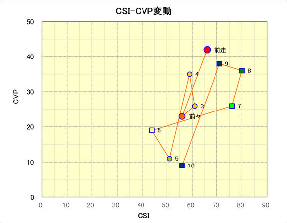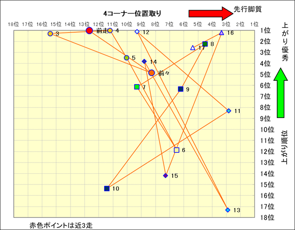 近走における4コーナーでの位置取りと上がり順位(頭数補正後) |