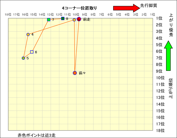 近走における4コーナーでの位置取りと上がり順位(頭数補正後) |