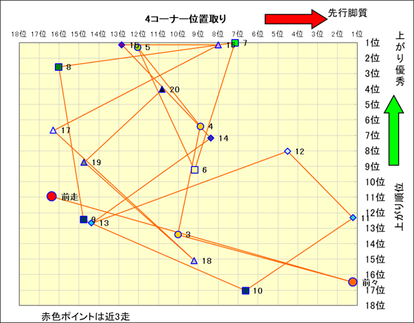 脚質解析 近20レースの4コーナーでの位置取りと上がり順位(頭数補正後) |