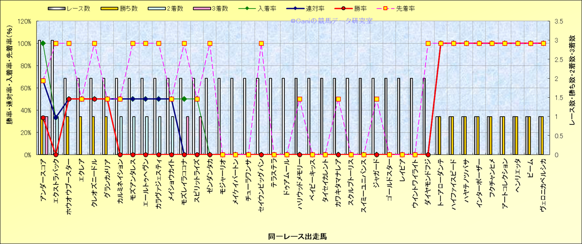 ライバル(相性)解析 同一レースに下記馬が出走した場合の成績とその馬に先着する先着率 |