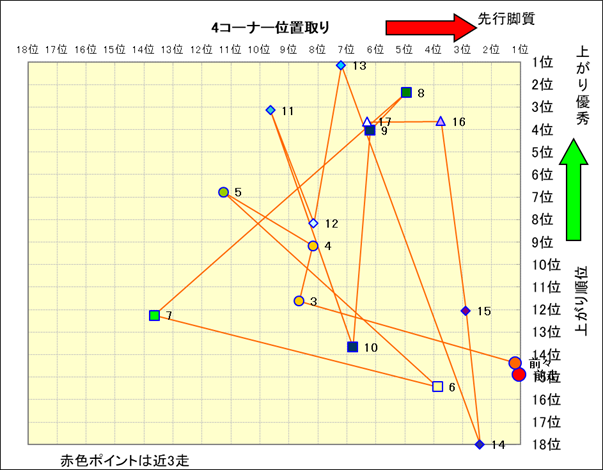 近走における4コーナーでの位置取りと上がり順位(頭数補正後) |