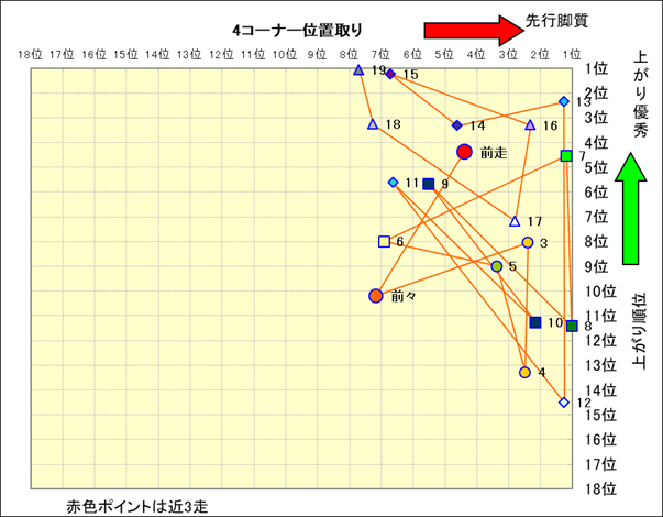 近走における4コーナーでの位置取りと上がり順位(頭数補正後) |