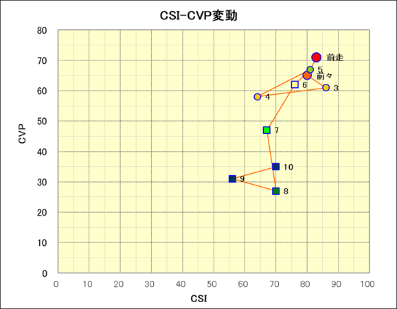 近走における4コーナーでの位置取りと上がり順位(頭数補正後) |