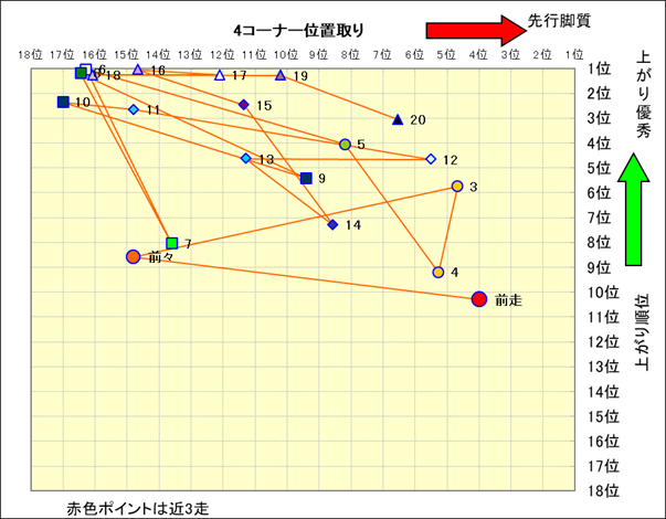近走における4コーナーでの位置取りと上がり順位(頭数補正後) |