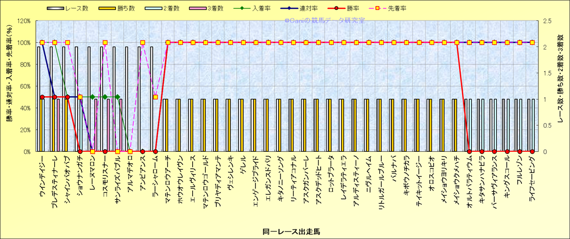 ライバル(相性)解析 同一レースに下記馬が出走した場合の成績とその馬に先着する先着率 |