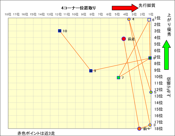 近走における4コーナーでの位置取りと上がり順位(頭数補正後) |