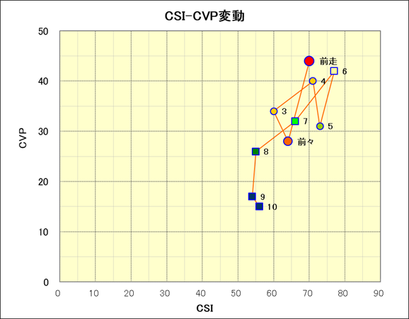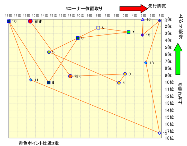 近走における4コーナーでの位置取りと上がり順位(頭数補正後) |
