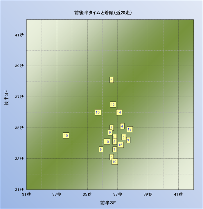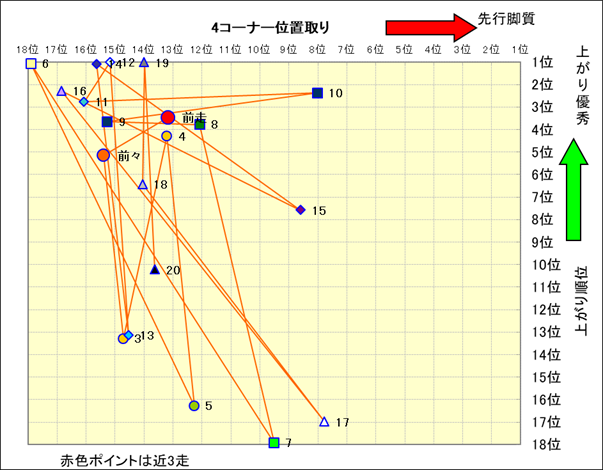 脚質解析 近20レースの4コーナーでの位置取りと上がり順位(頭数補正後) |