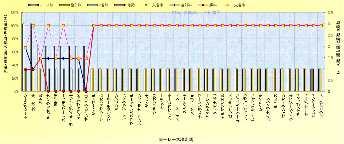 ライバル(相性)解析 同一レースに下記馬が出走した場合の成績とその馬に先着する先着率 |