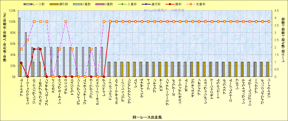 ライバル(相性)解析 同一レースに下記馬が出走した場合の成績とその馬に先着する先着率 |