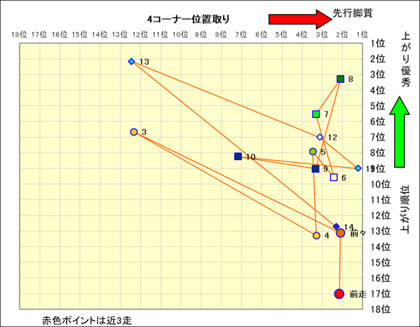 近走における4コーナーでの位置取りと上がり順位(頭数補正後) |