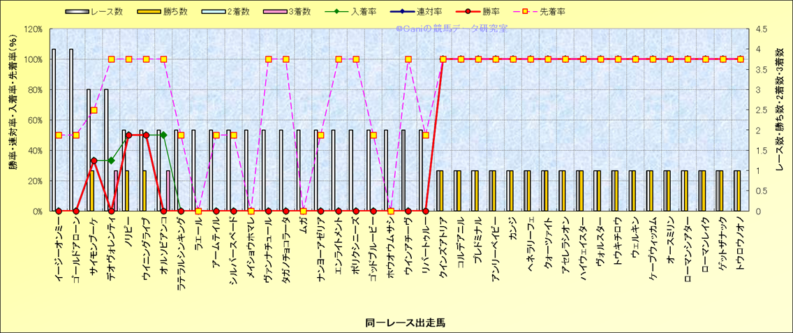 ライバル(相性)解析 同一レースに下記馬が出走した場合の成績とその馬に先着する先着率 |