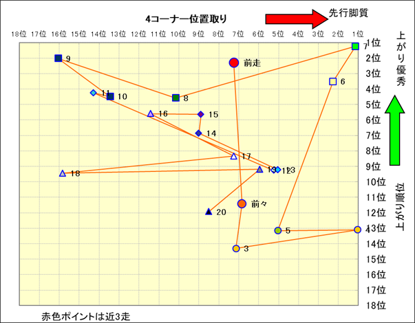 脚質解析 近20レースの4コーナーでの位置取りと上がり順位(頭数補正後) |