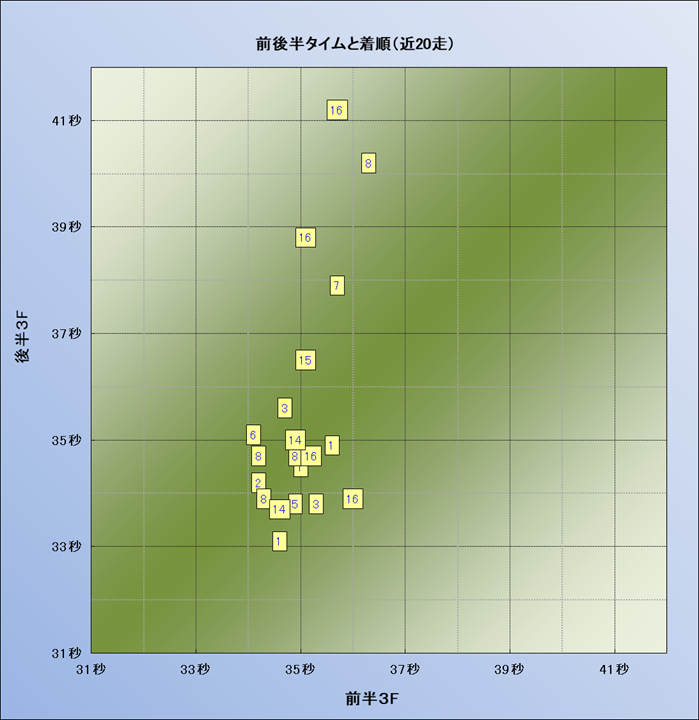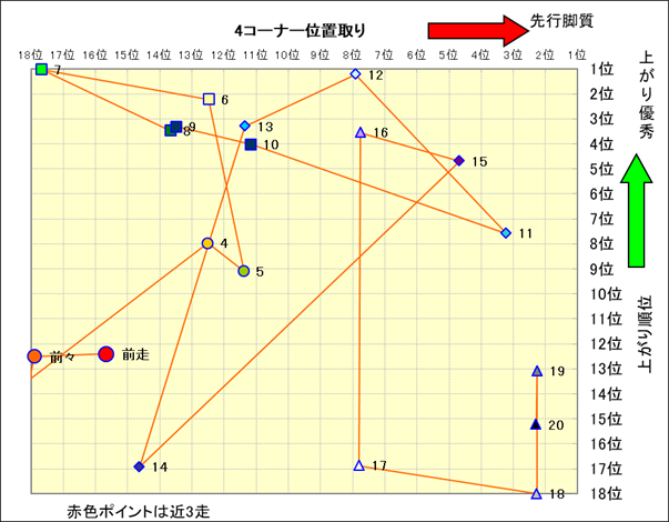 脚質解析 近20レースの4コーナーでの位置取りと上がり順位(頭数補正後) |