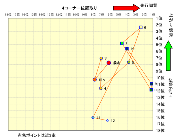 近走における4コーナーでの位置取りと上がり順位(頭数補正後) |