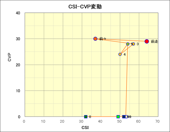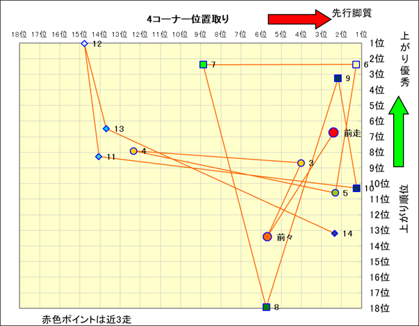 近走における4コーナーでの位置取りと上がり順位(頭数補正後) |