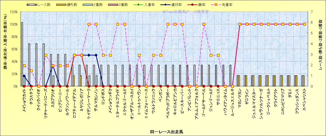 ライバル(相性)解析 同一レースに下記馬が出走した場合の成績とその馬に先着する先着率 |