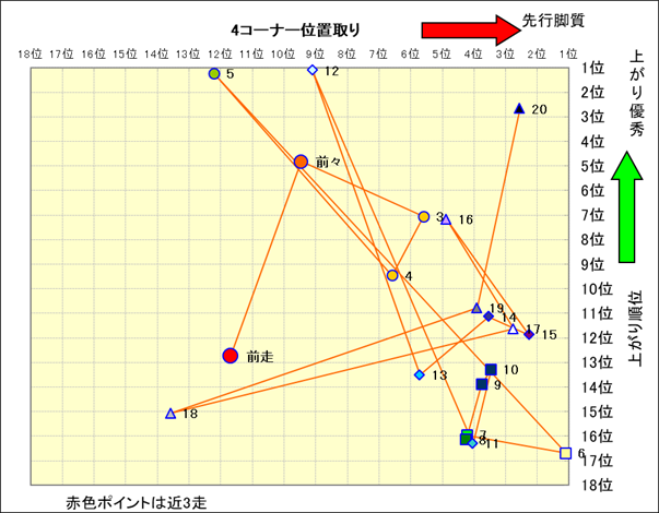 脚質解析 近20レースの4コーナーでの位置取りと上がり順位(頭数補正後) |