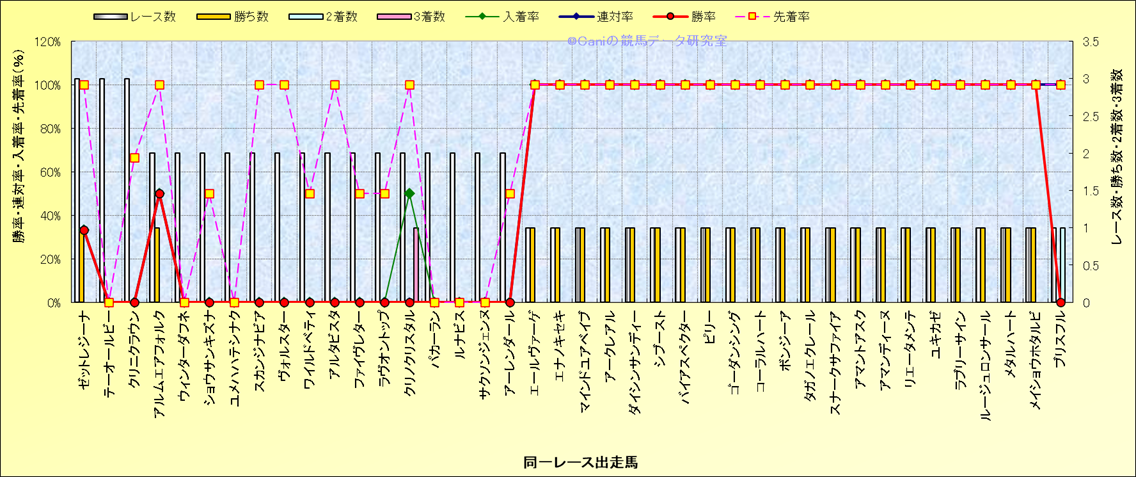 ライバル(相性)解析 同一レースに下記馬が出走した場合の成績とその馬に先着する先着率 |