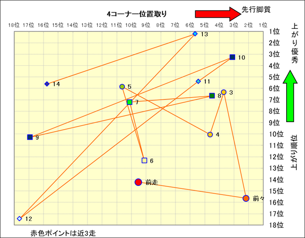 近走における4コーナーでの位置取りと上がり順位(頭数補正後) |