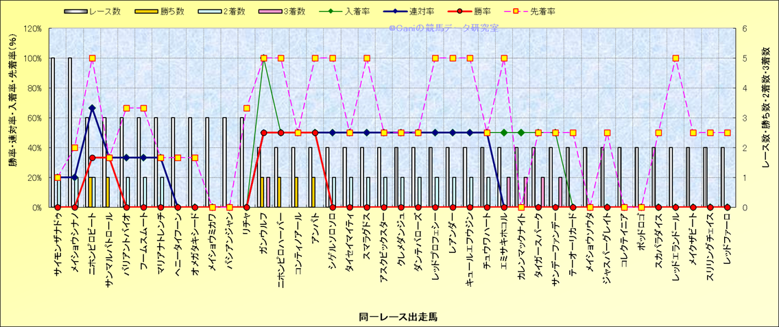 ライバル(相性)解析 同一レースに下記馬が出走した場合の成績とその馬に先着する先着率 |