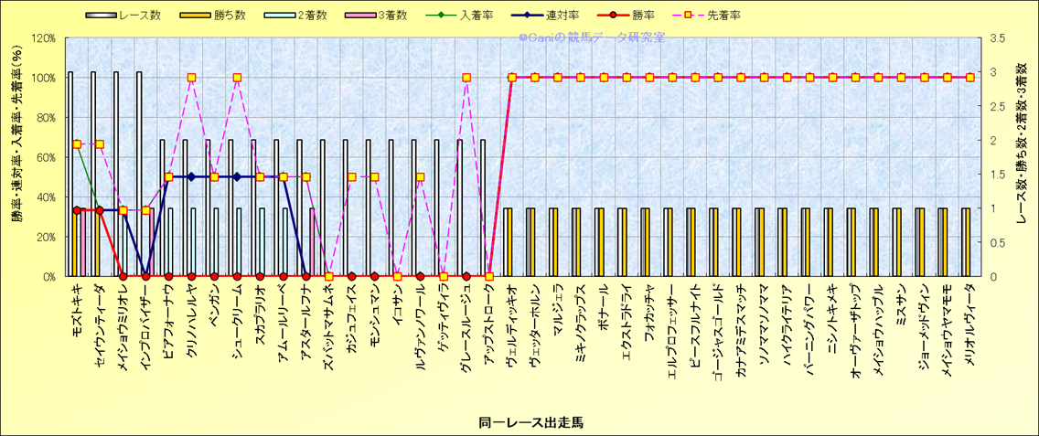 ライバル(相性)解析 同一レースに下記馬が出走した場合の成績とその馬に先着する先着率 |