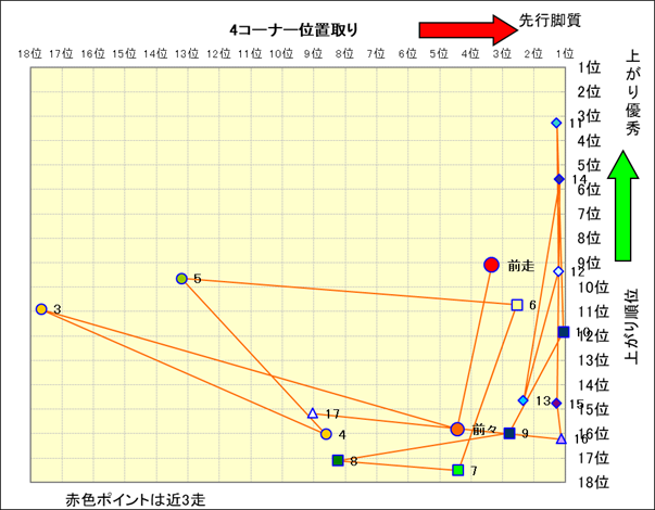 近走における4コーナーでの位置取りと上がり順位(頭数補正後) |