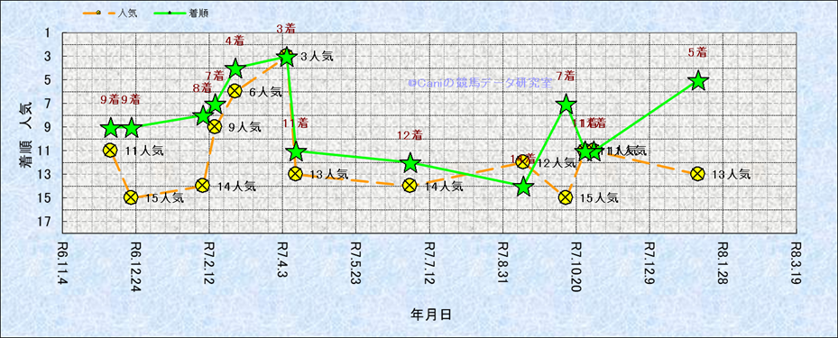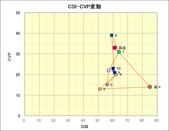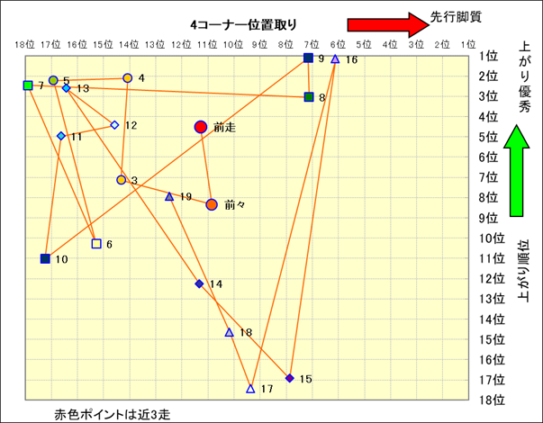近走における4コーナーでの位置取りと上がり順位(頭数補正後) |