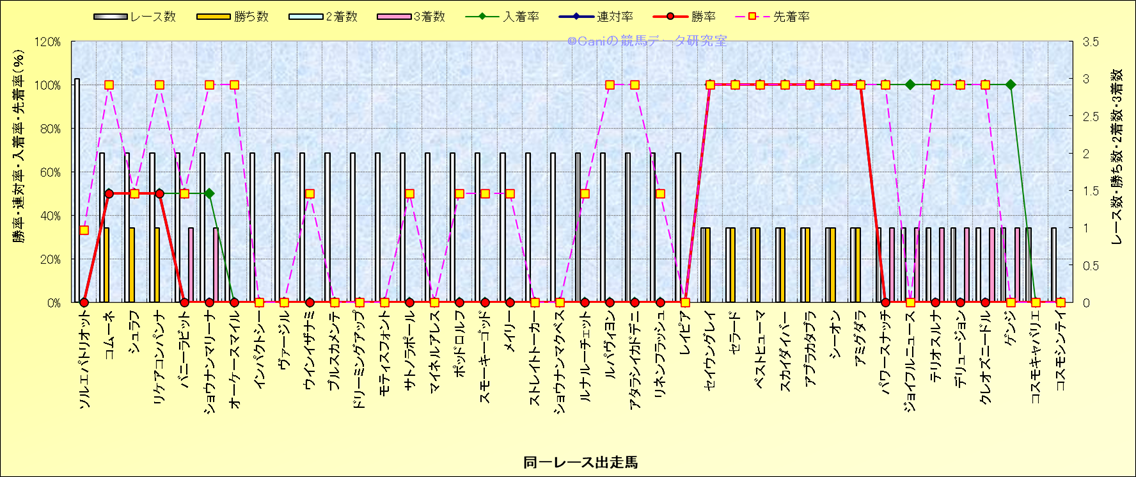 ライバル(相性)解析 同一レースに下記馬が出走した場合の成績とその馬に先着する先着率 |