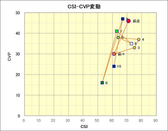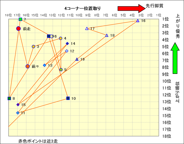 近走における4コーナーでの位置取りと上がり順位(頭数補正後) |