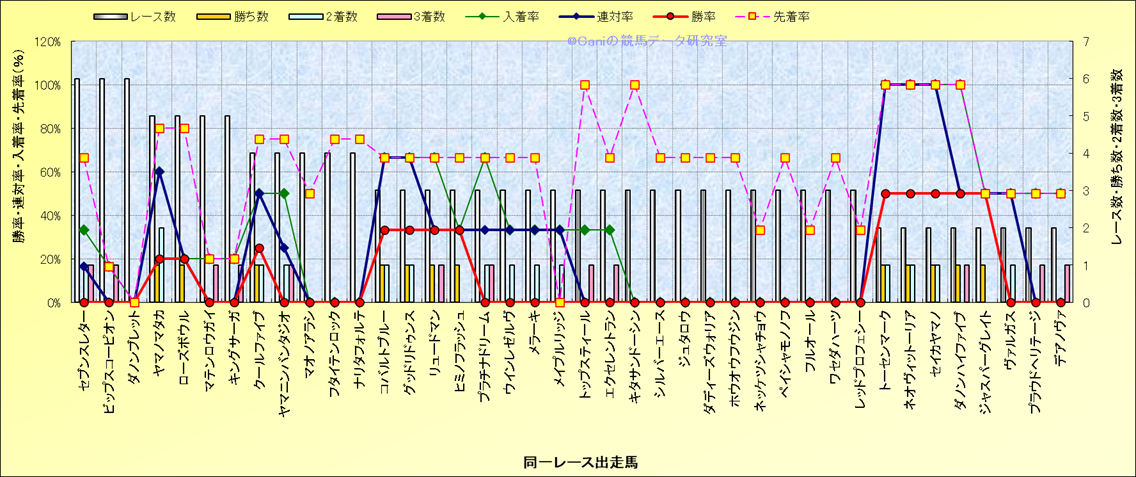 ライバル(相性)解析 同一レースに下記馬が出走した場合の成績とその馬に先着する先着率 |