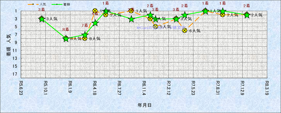 脚質解析 近20レースの4コーナーでの位置取りと上がり順位(頭数補正後) |