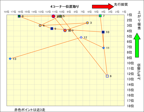 近走における4コーナーでの位置取りと上がり順位(頭数補正後) |