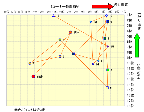 近走における4コーナーでの位置取りと上がり順位(頭数補正後) |