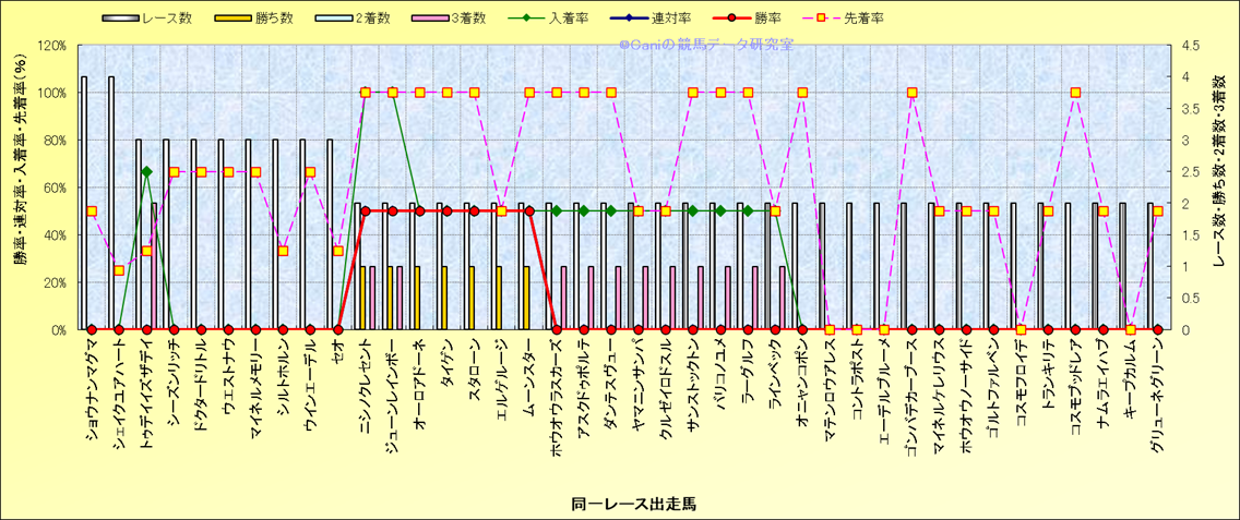 ライバル(相性)解析 同一レースに下記馬が出走した場合の成績とその馬に先着する先着率 |