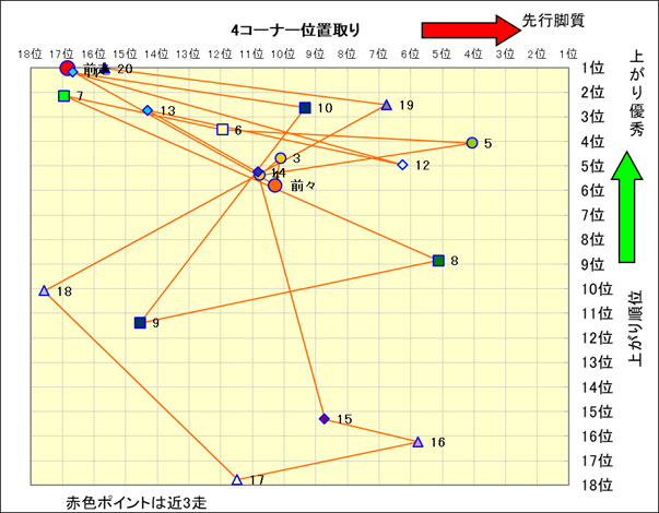 脚質解析 近20レースの4コーナーでの位置取りと上がり順位(頭数補正後) |