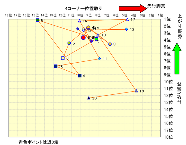 脚質解析 近20レースの4コーナーでの位置取りと上がり順位(頭数補正後) |