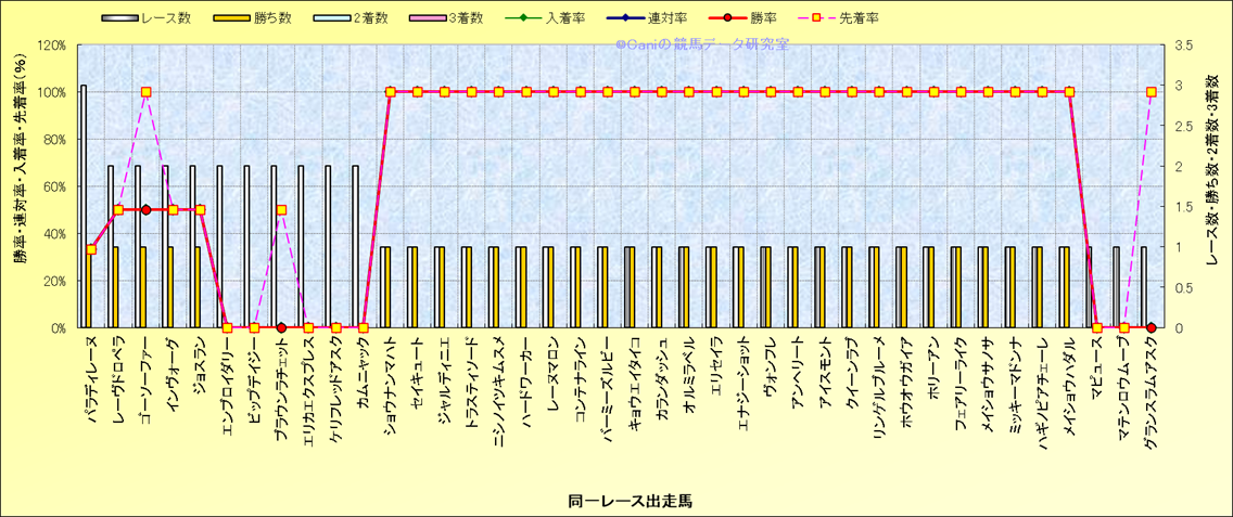 ライバル(相性)解析 同一レースに下記馬が出走した場合の成績とその馬に先着する先着率 |