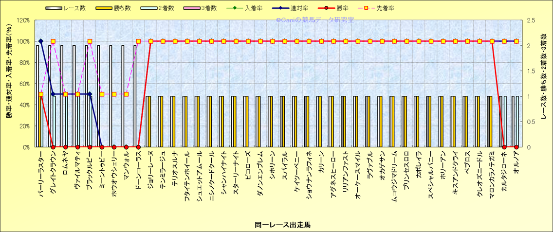 ライバル(相性)解析 同一レースに下記馬が出走した場合の成績とその馬に先着する先着率 |