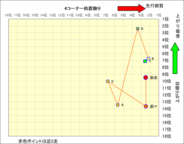 近走における4コーナーでの位置取りと上がり順位(頭数補正後) |