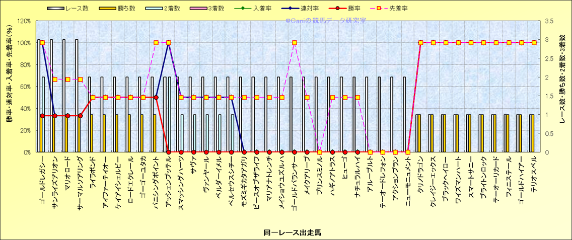ライバル(相性)解析 同一レースに下記馬が出走した場合の成績とその馬に先着する先着率 |