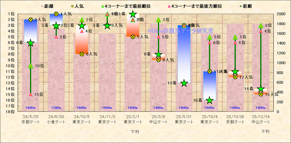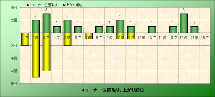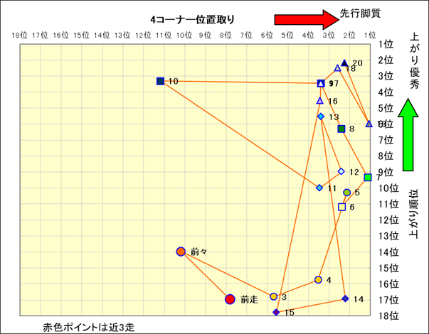脚質解析 近20レースの4コーナーでの位置取りと上がり順位(頭数補正後) |