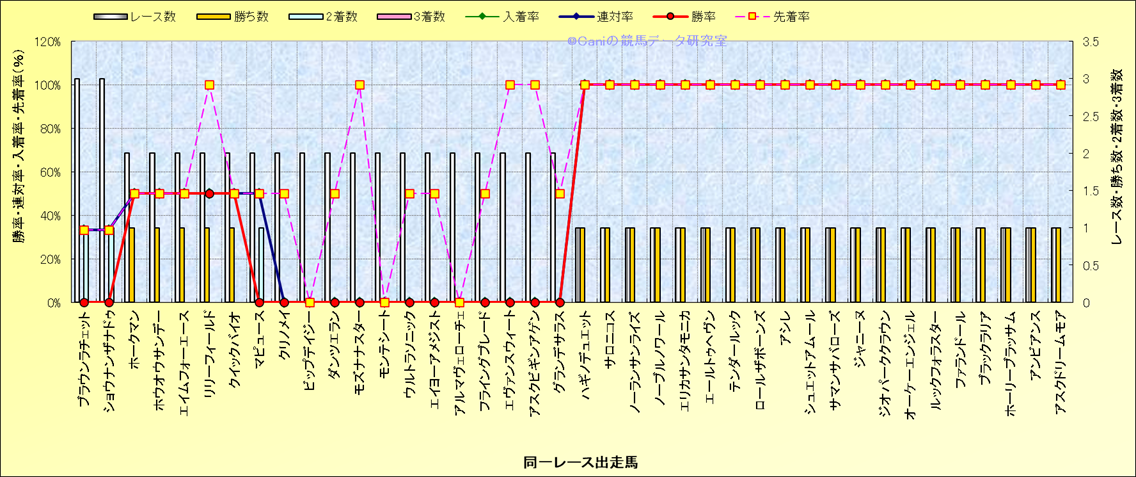 ライバル(相性)解析 同一レースに下記馬が出走した場合の成績とその馬に先着する先着率 |