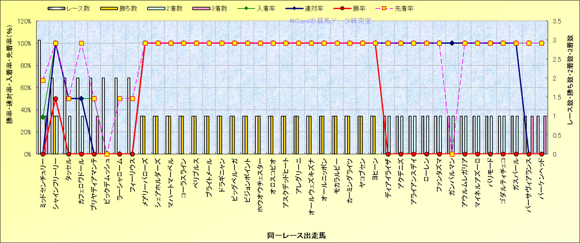 ライバル(相性)解析 同一レースに下記馬が出走した場合の成績とその馬に先着する先着率 |