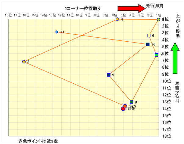 近走における4コーナーでの位置取りと上がり順位(頭数補正後) |