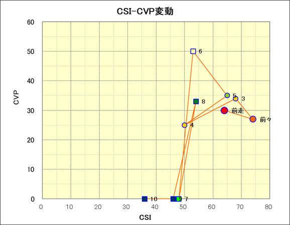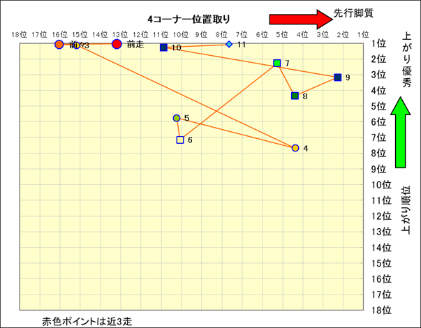 近走における4コーナーでの位置取りと上がり順位(頭数補正後) |