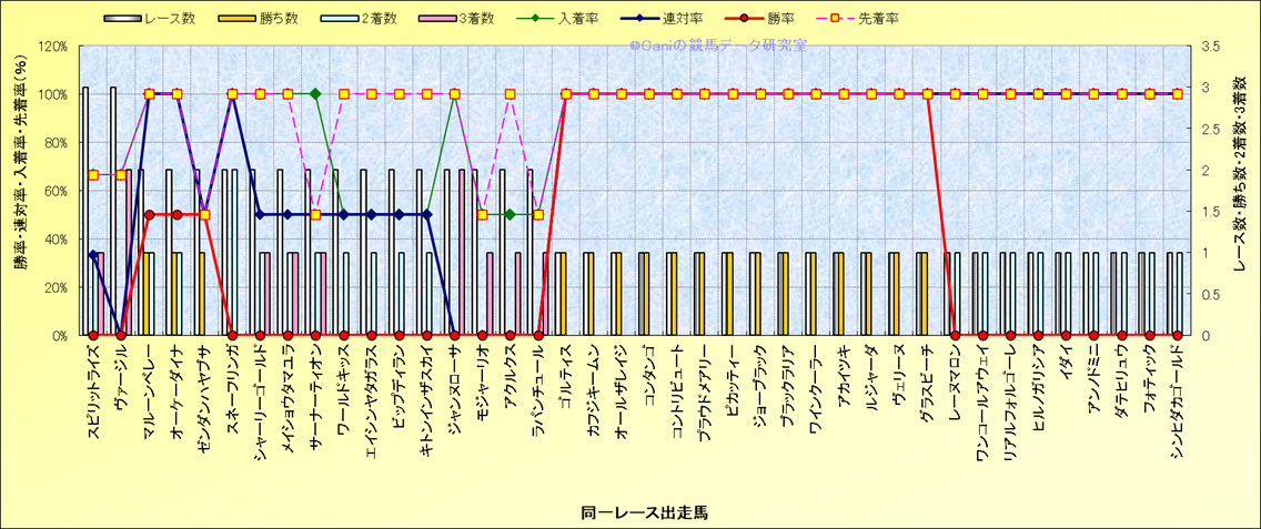 ライバル(相性)解析 同一レースに下記馬が出走した場合の成績とその馬に先着する先着率 |
