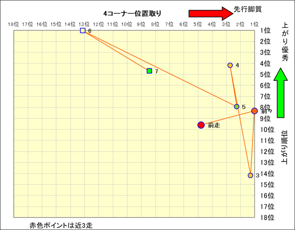 近走における4コーナーでの位置取りと上がり順位(頭数補正後) |