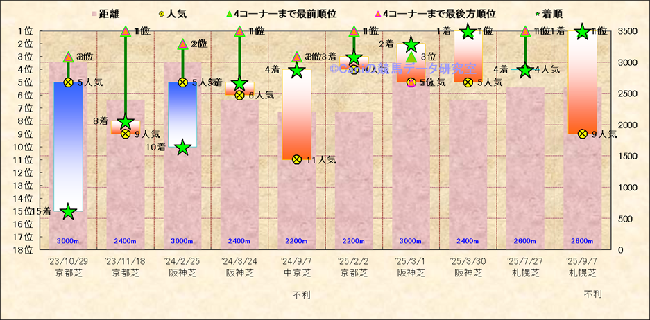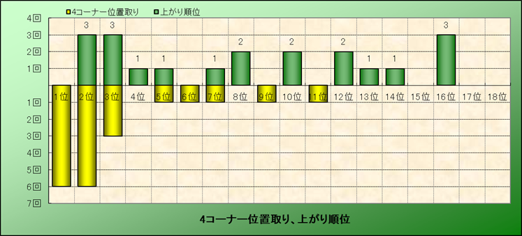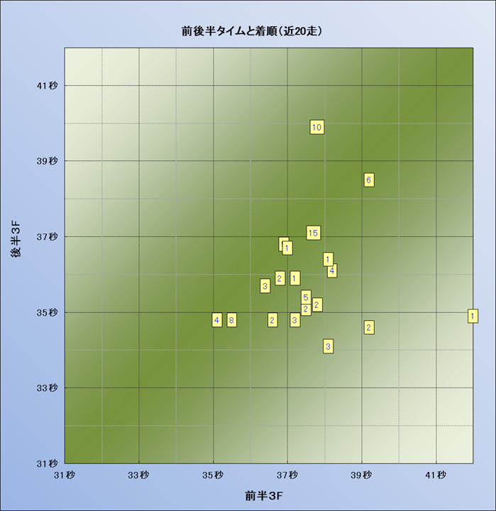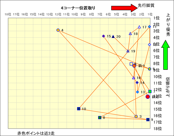 脚質解析 近20レースの4コーナーでの位置取りと上がり順位(頭数補正後) |