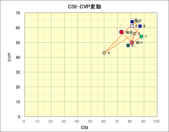 近走における4コーナーでの位置取りと上がり順位(頭数補正後) |